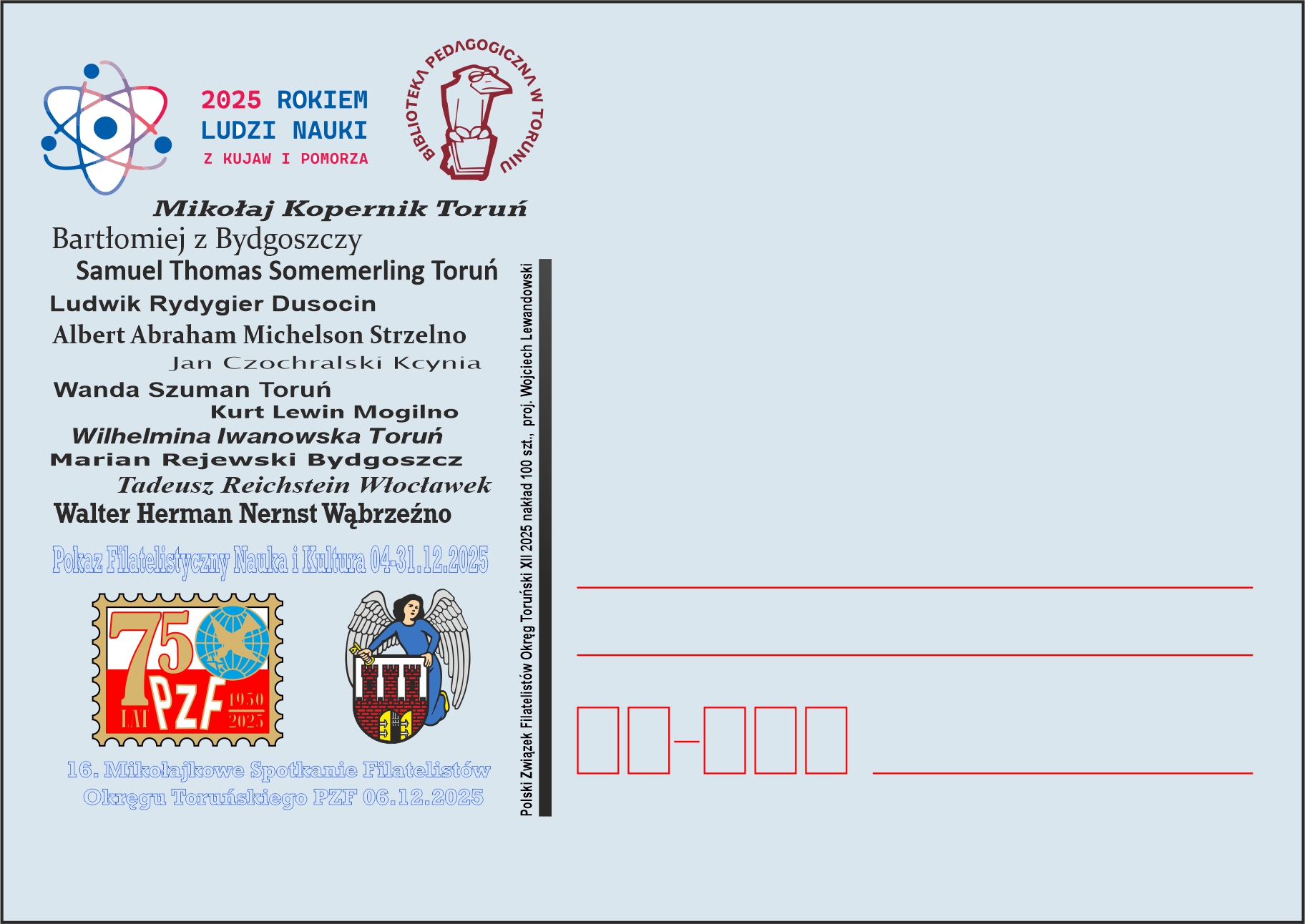 Okręg Toruński Polskiego Związku Filatelistów serdecznie zaprasza na otwarcie pokazu filatelistycznego – “NAUKA I KULTURA” w dniu 4 grudnia 2025 roku o godz. 14.00 do Biblioteki Pedagogicznej przy ul. gen. H. Dąbrowskiego 4 w Toruniu.