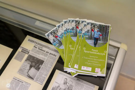 Zdjęcia przedstawiają salę wystawową Biblioteki Pedagogicznej w Toruniu. Wewnątrz znajdują się ludzie, którzy przyszli na spotkanie (zarówno kobiety, jak i mężczyźni). Na ścianach wiszą plansze ze zdjęciami uczestników biegów. W czterech gablotach stojących pod ścianą zaprezentowano medale, wycinki z gazet oraz numery startowe ze Spartathlonu.