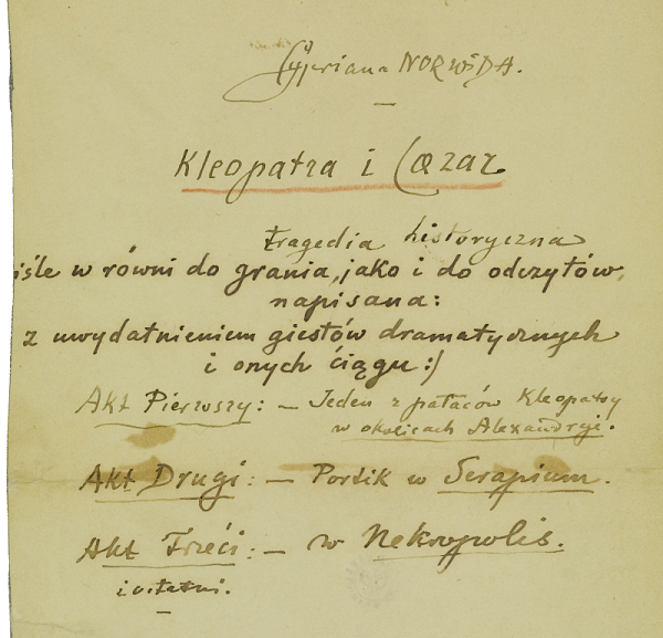 Strona tytułowa rękopisu tragedii „Kleopatra i Cezar”,